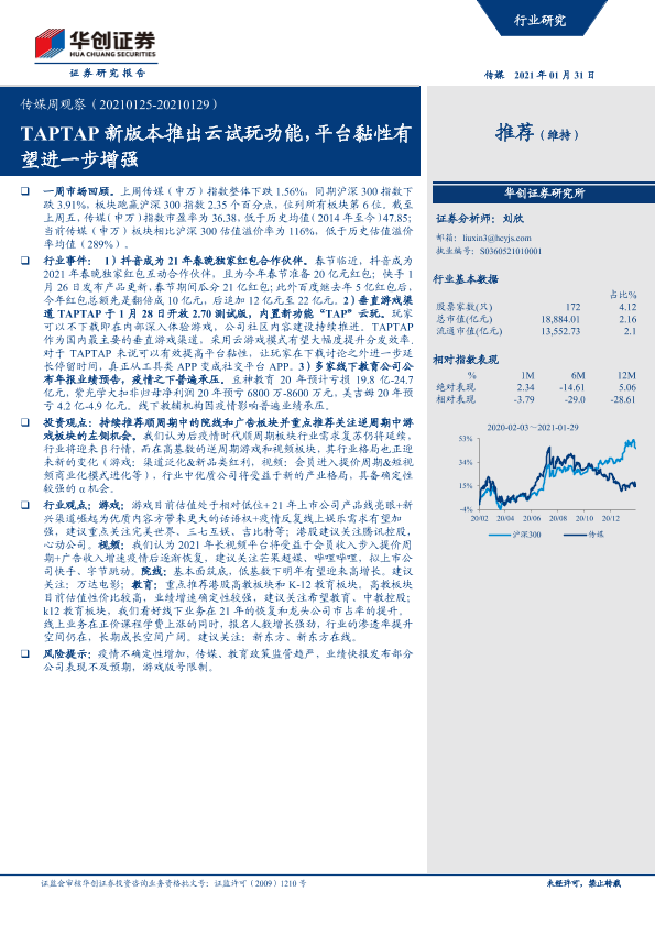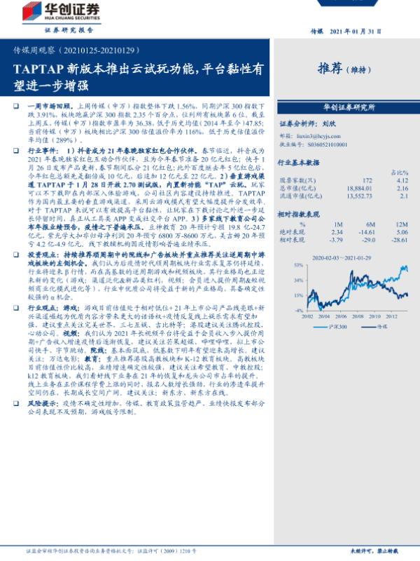 【华创证券】【20210131】传媒周观察:TAPTAP 新版本推出云试玩功能,平台黏性有望进一步增强-20页
