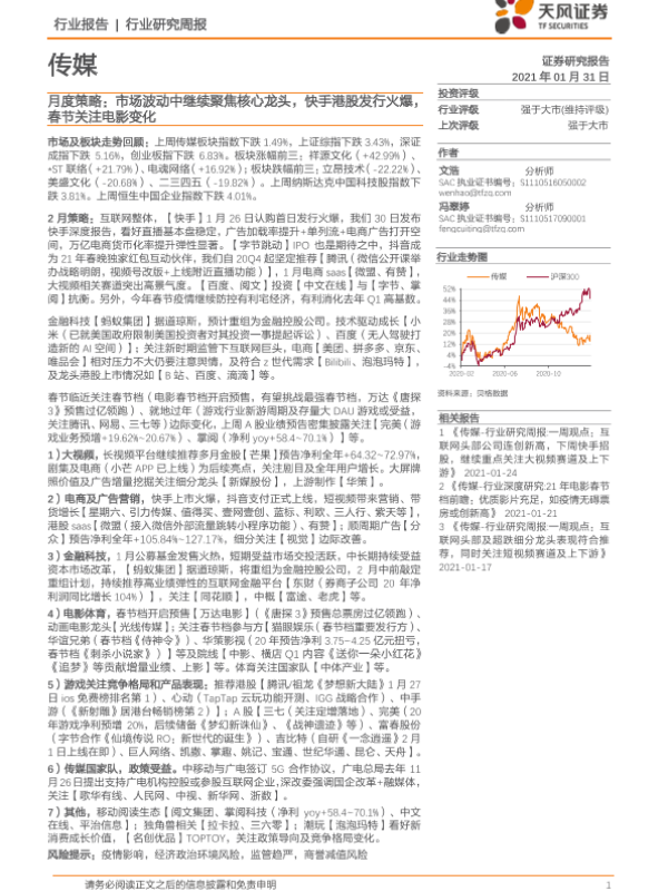 【天风证券】【20210131】20210131-天风证券-传媒行业月度策略:市场波动中继续聚焦核心龙头,快手港股发行火爆,春节关注电影变化-28页