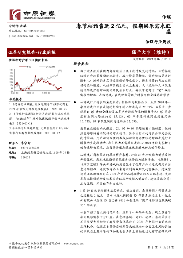 【中原证券】【20210201】传媒行业周报:春节档预售近2亿元,假期娱乐需求旺盛-19页