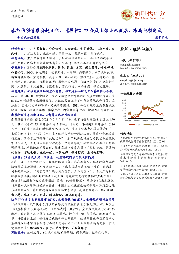 【新时代证券】【20210207】新时代传媒周报:春节档预售票房超4亿,《原神》73分成上架小米商店,布局视频游戏-34页