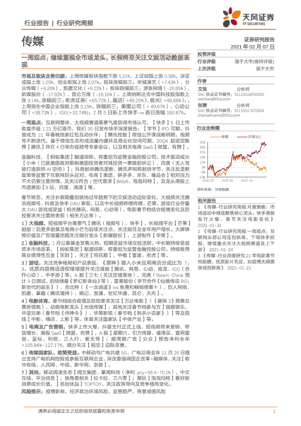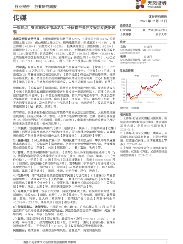 【天风证券】【20210207】传媒一周观点:继续重视全市场龙头,长假将至关注文娱活动数据表现-23页