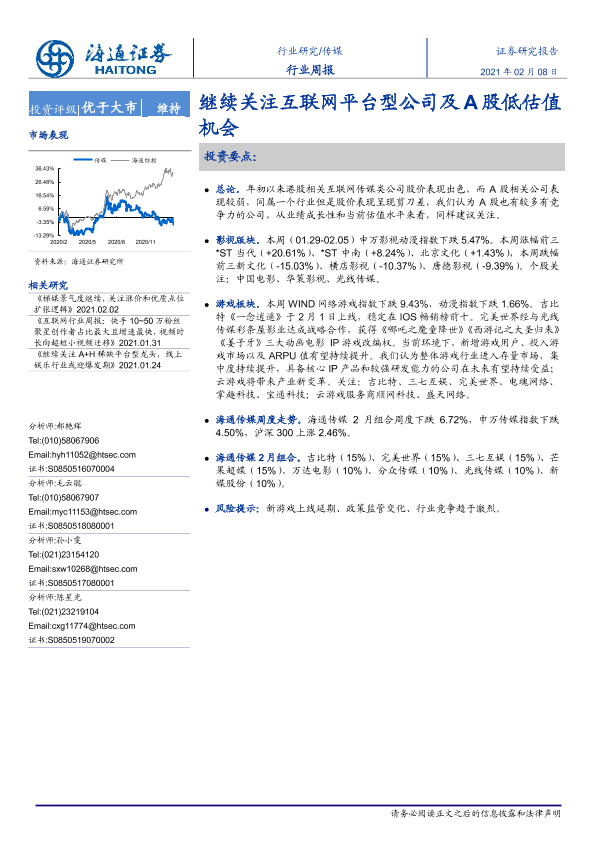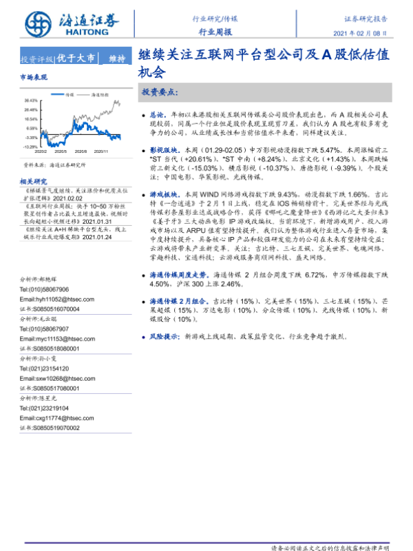 【海通证券】【20210208】20210208-海通证券-传媒行业周报:继续关注互联网平台型公司及A股低估值机会-10页