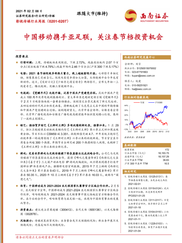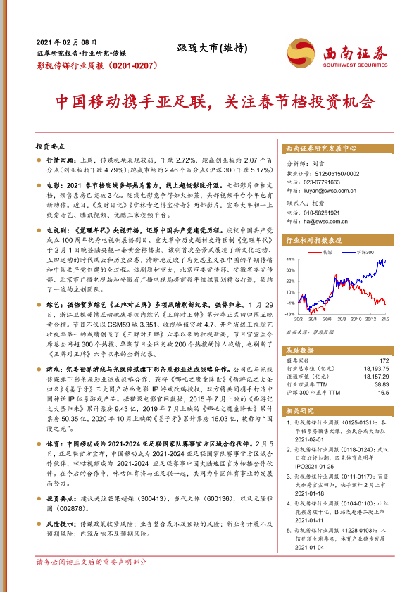 【西南证券】【20210208】20210208-西南证券-影视传媒行业周报:中国移动携手亚足联,关注春节档投资机会-22页