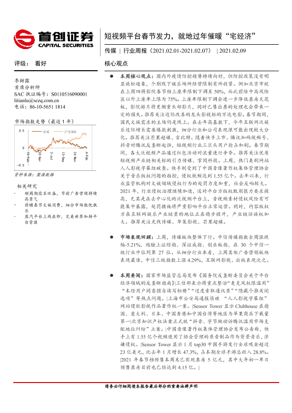 【首创证券】【20210209】20210209-首创证券-传媒行业周报:短视频平台春节发力,就地过年催暖“宅经济”-13页