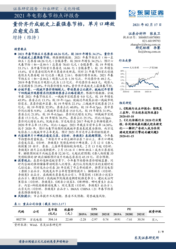【东吴证券】【20210217】2021年电影春节档点评报告:量价齐升成就史上最强春节档,单片口碑效应愈发凸显-9页