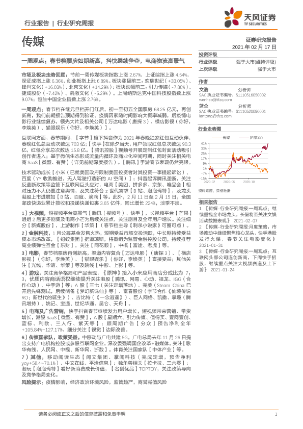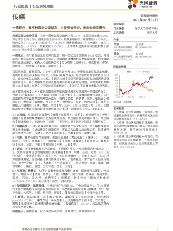 【天风证券】【20210217】传媒一周观点:春节档票房如期新高,抖快继续争夺,电商物流高景气-14页
