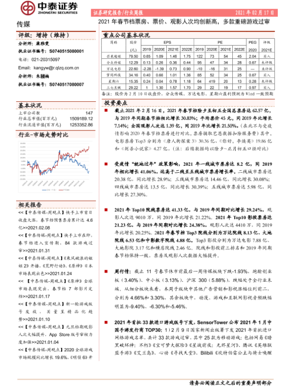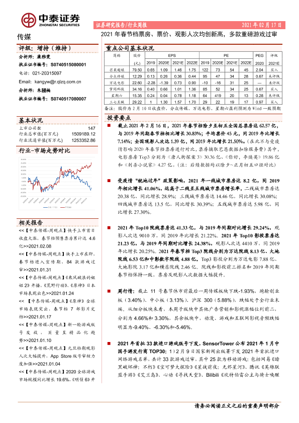 【中泰证券】【20210217】2021年春节档票房、票价、观影人次均创新高,多款重磅游戏过审-11页