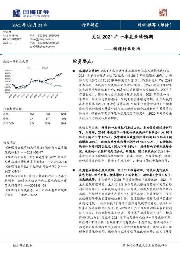 【国海证券】【20210221】20210221-国海证券-传媒行业周报:关注2021年一季度业绩预期-18页