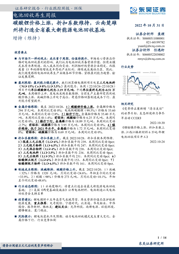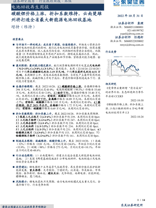 【东吴证券】【20221031】电池回收再生周报:碳酸锂价格上涨,折扣系数维持,云南楚雄州将打造全省最大新能源电池回收基地-14页
