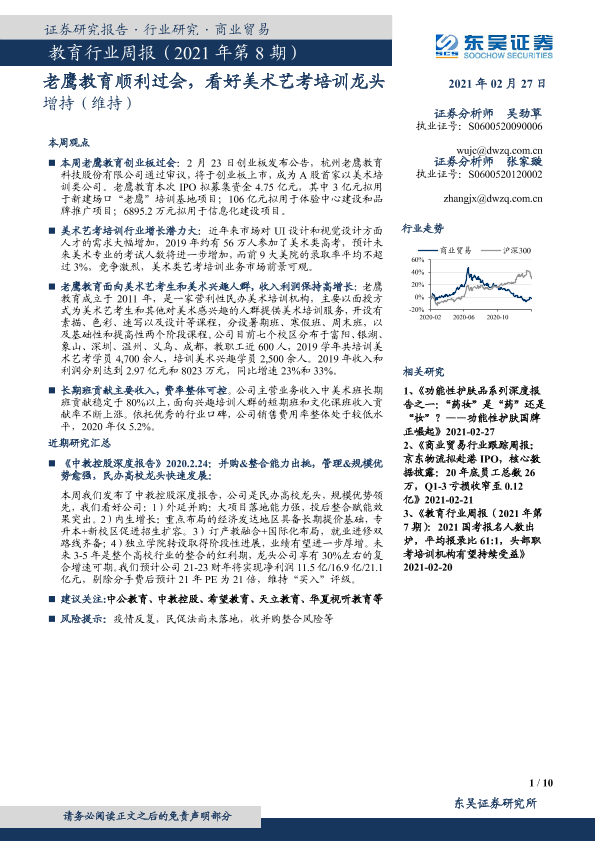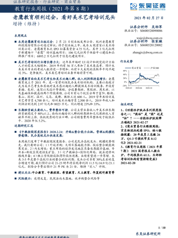 【东吴证券】【20210227】教育行业周报(2021年第8期):老鹰教育顺利过会,看好美术艺考培训龙头-10页