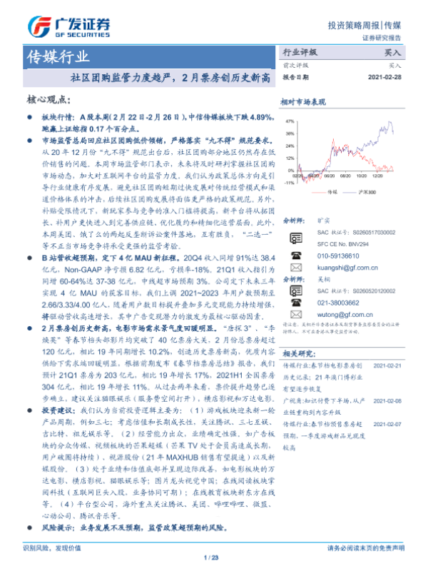 2月票房 B站 传媒行业 市场监管 社区团购