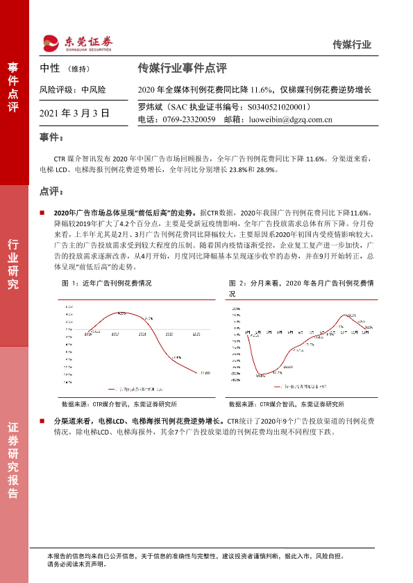 【东莞证券】【20210303】20210303-东莞证券-传媒行业事件点评:2020年全媒体刊例花费同比降11.6%,仅梯媒刊例花费逆势增长-4页