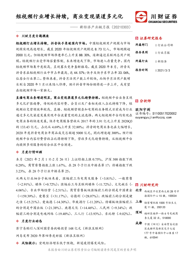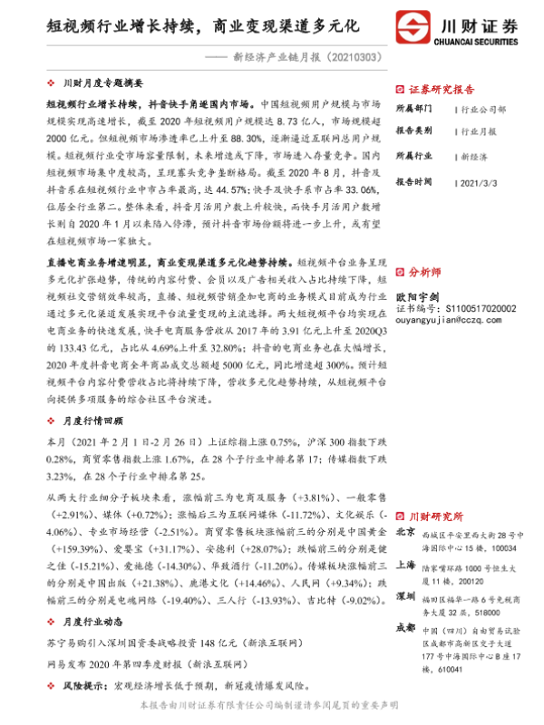 【川财证券】【20210303】新经济产业链月报:短视频行业增长持续,商业变现渠道多元化-15页