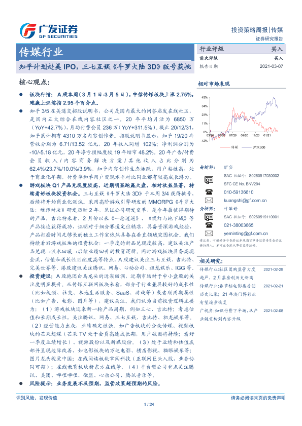 【广发证券】【20210307】20210307-广发证券-传媒行业投资策略周报:知乎计划赴美IPO,三七互娱《斗罗大陆3D》版号获批-24页