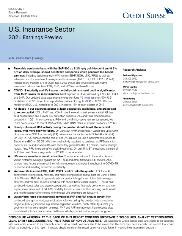 【瑞信(Credit Suisse)】【20210720】瑞信-美股保险行业-2021年第二季度业绩预览-31页