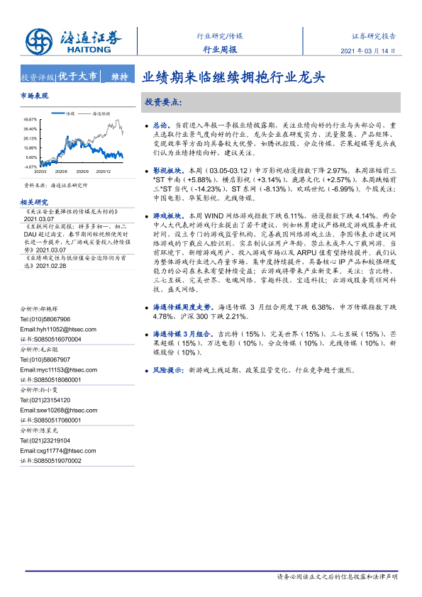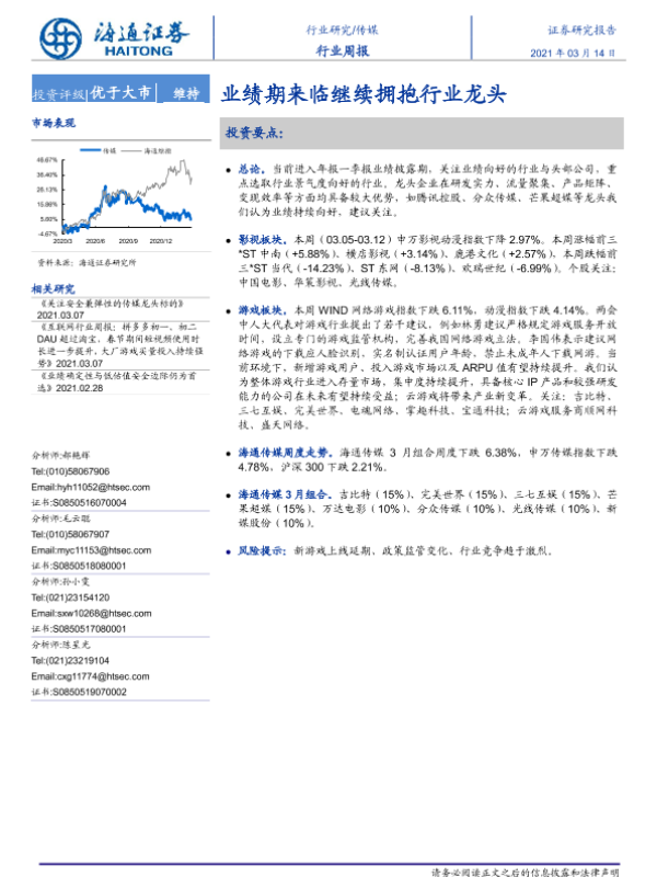 【海通证券】【20210314】20210314-海通证券-传媒行业周报:业绩期来临继续拥抱行业龙头-10页