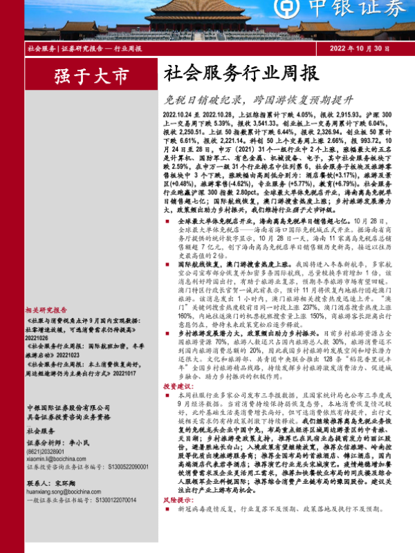 【中银证券】【20221030】社会服务行业周报:免税日销破纪录,跨国游恢复预期提升-31页