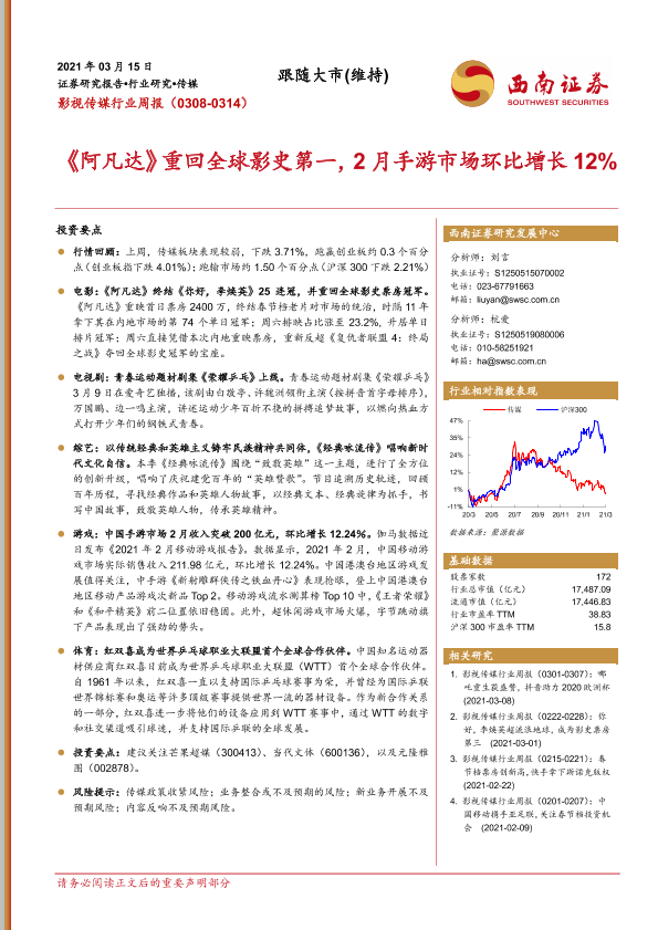 【西南证券】【20210315】20210315-西南证券-影视传媒行业周报:《阿凡达》重回全球影史第一,2月手游市场环比增长12%-20页
