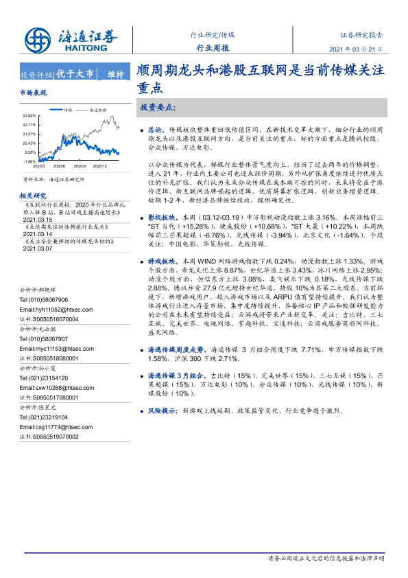 【海通证券】【20210321】20210321-海通证券-传媒行业周报:顺周期龙头和港股互联网是当前传媒关注重点-10页