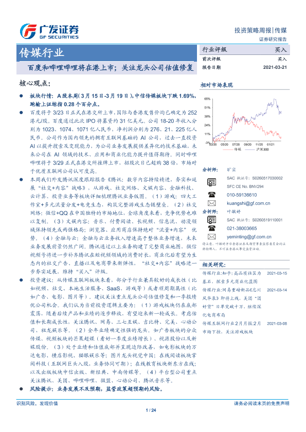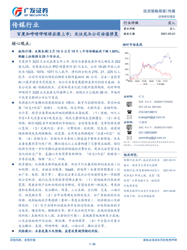 【广发证券】【20210321】20210321-广发证券-传媒行业:百度和哔哩哔哩将在港上市;关注龙头公司估值修复-24页