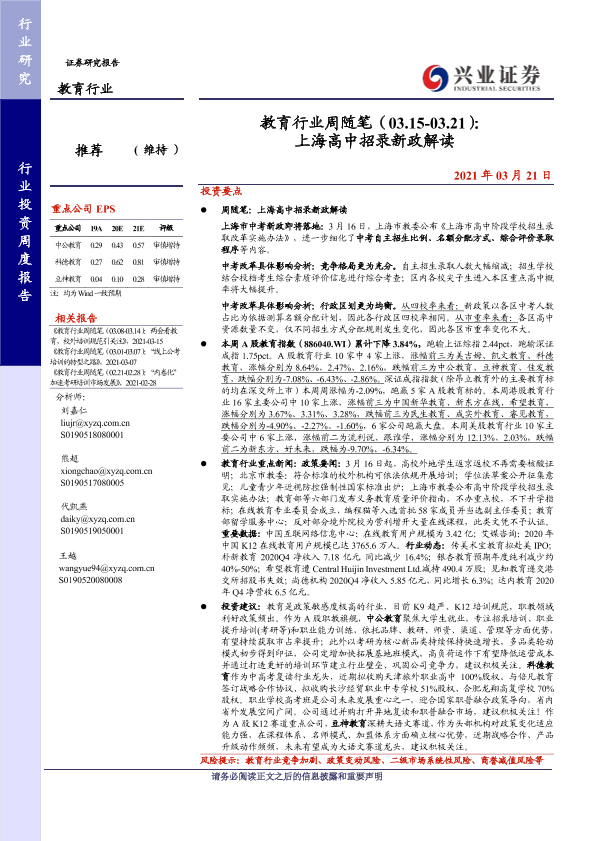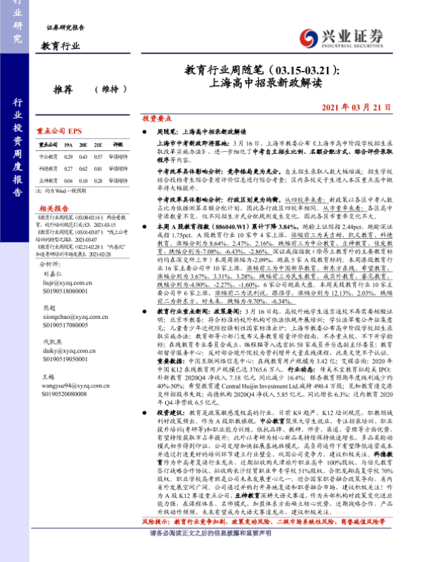 【兴业证券】【20210321】教育行业周随笔(03.15-03.21): 上海高中招录新政解读-16页