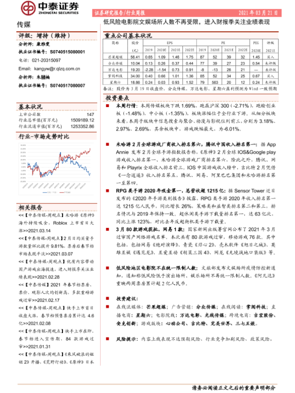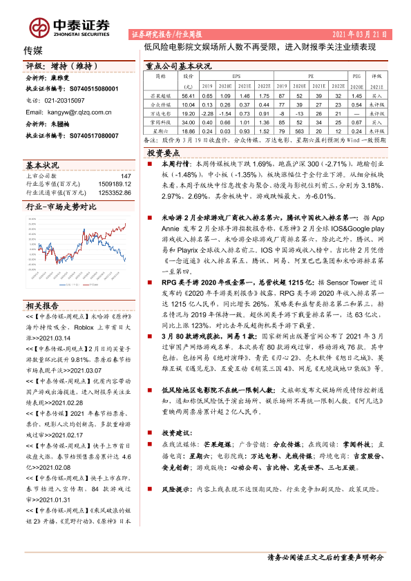 【中泰证券】【20210321】中泰证券-传媒行业周报:低风险电影院文娱场所人数不再受限,进入财报季关注业绩表现-12页