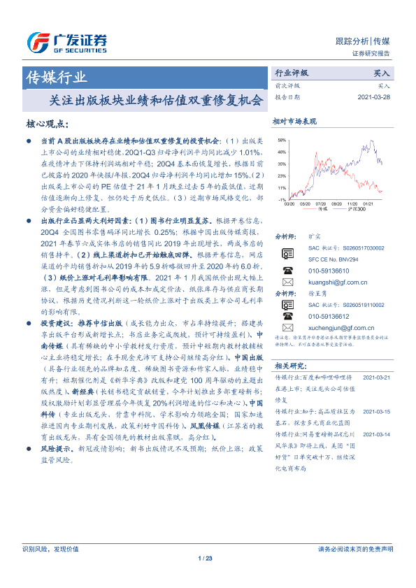 【广发证券】【20210328】20210328-广发证券-传媒行业跟踪分析:关注出版板块业绩和估值双重修复机会-23页