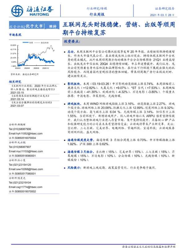 【海通证券】【20210328】20210328-海通证券-传媒行业周报:互联网龙头财报稳健,营销、出版等顺周期平台持续复苏-10页