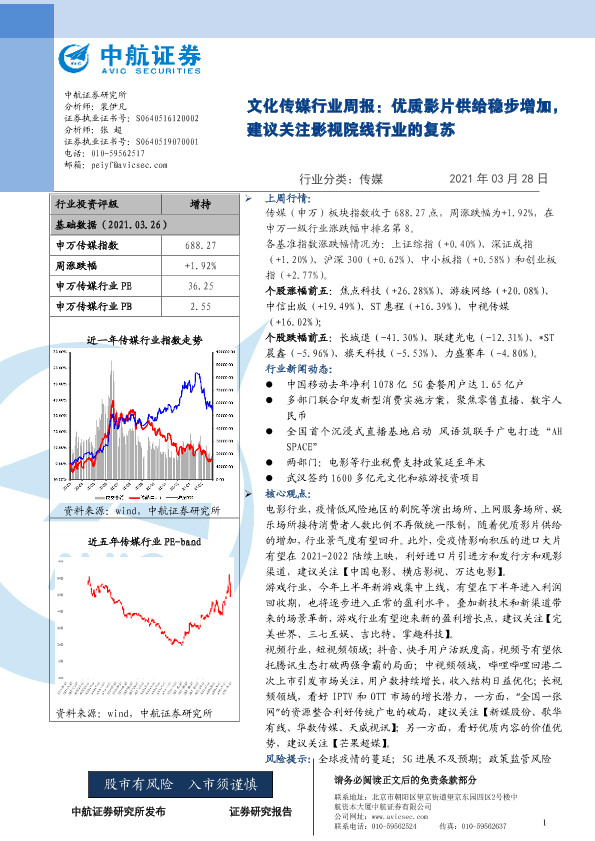 【中航证券】【20210328】20210328-中航证券-文化传媒行业周报:优质影片供给稳步增加,建议关注影视院线行业的复苏-7页
