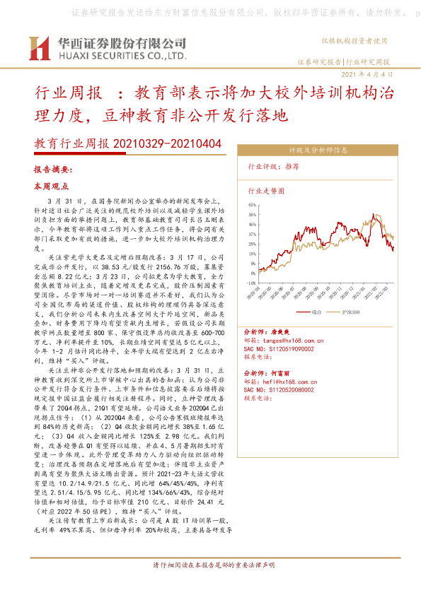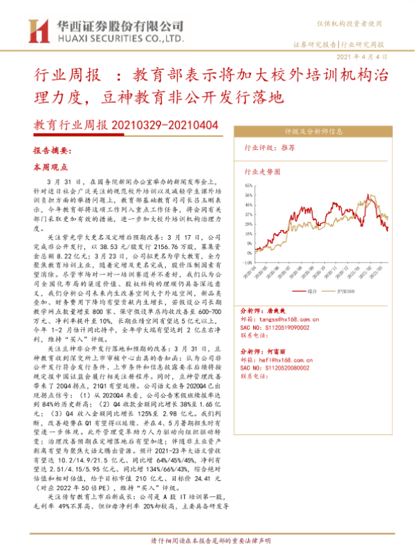 【华西证券】【20210404】20210404-华西证券-教育行业周报:教育部表示将加大校外培训机构治理力度,豆神教育非公开发行落地-19页