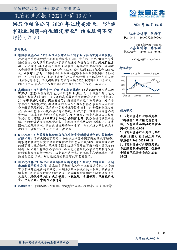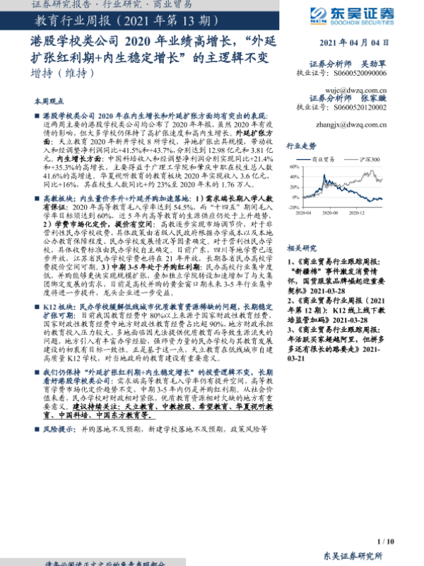 【东吴证券】【20210404】教育行业周报(2021年第13期):港股学校类公司2020年业绩高增长,“外延扩张红利期+内生稳定增长”的主逻辑不变-10页