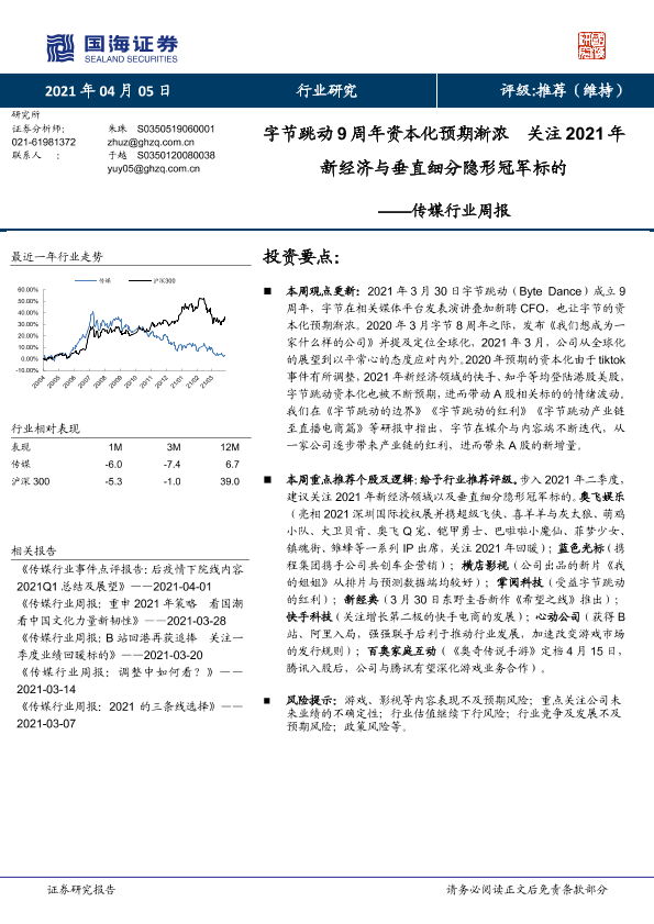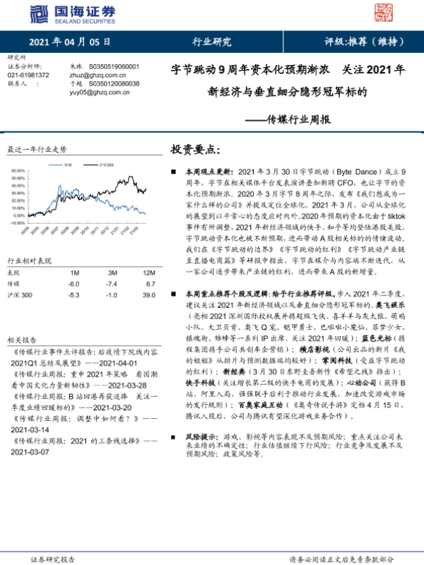 【国海证券】【20210405】20210405-国海证券-传媒行业周报:字节跳动9周年资本化预期渐浓 关注2021年新经济与垂直细分隐形冠军标的-19页