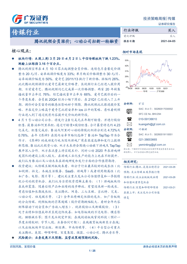 【广发证券】【20210405】20210405-广发证券-传媒行业投资策略周报:腾讯视频会员涨价;心动公司拟新一轮融资-25页