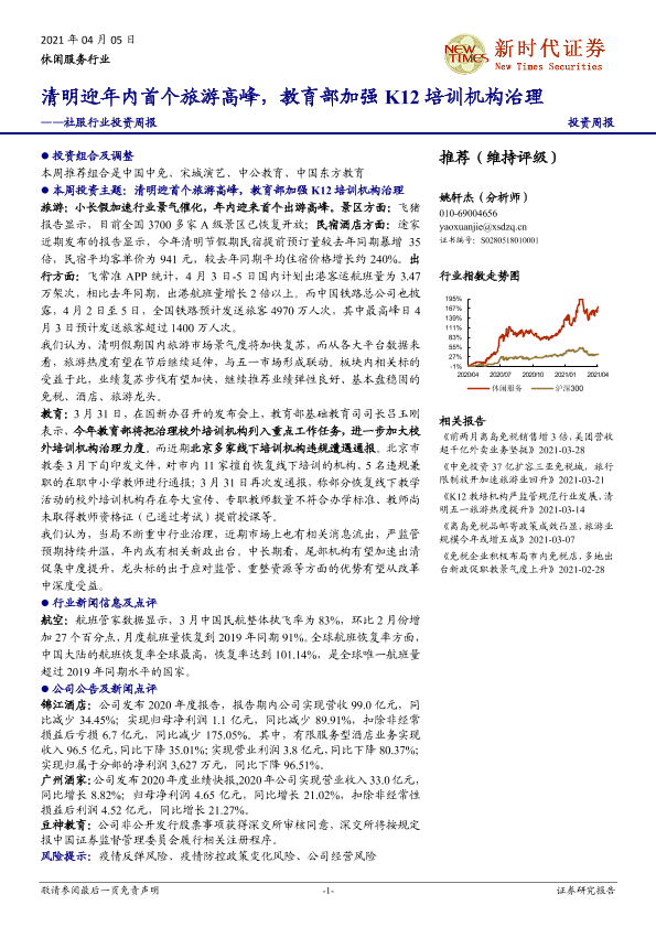 【新时代证券】【20210405】社服行业投资周报:清明迎年内首个旅游高峰,教育部加强K12培训机构治理-16页