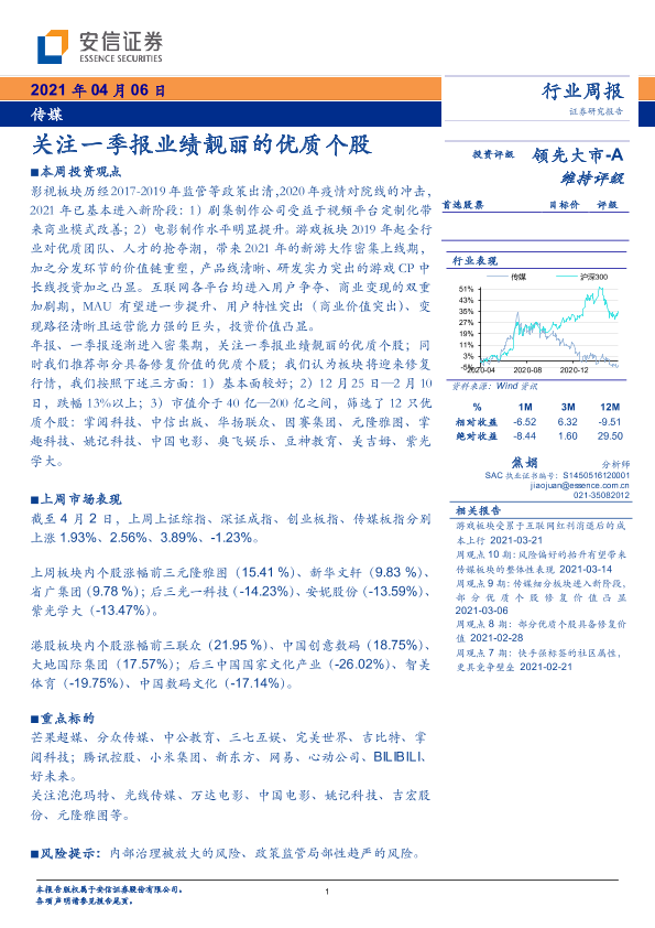 【安信证券】【20210406】20210406-安信证券-传媒行业周报:关注一季报业绩靓丽的优质个股-11页