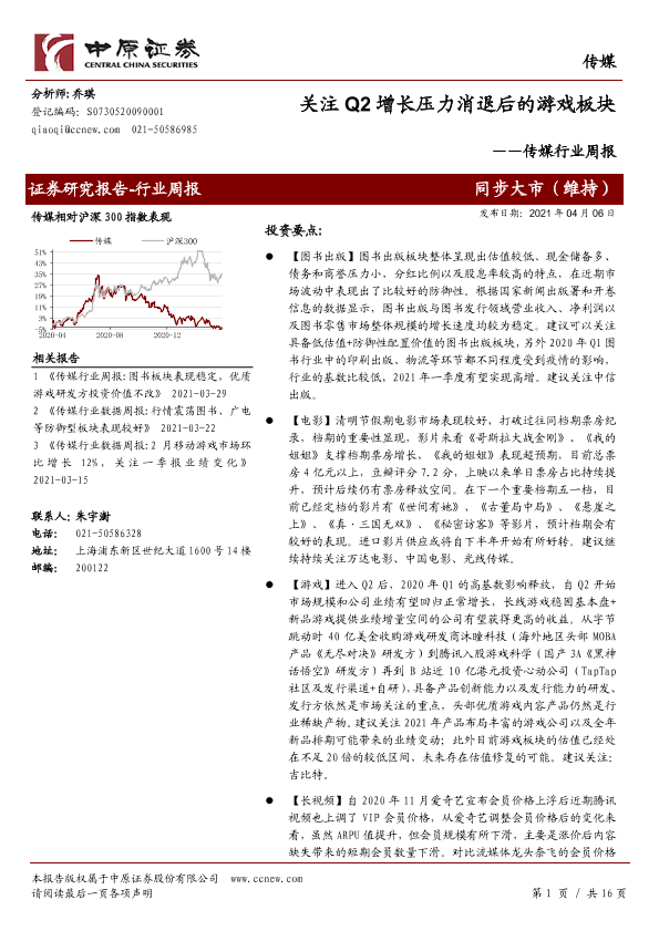 【中原证券】【20210406】传媒行业周报:关注Q2增长压力消退后的游戏板块-16页