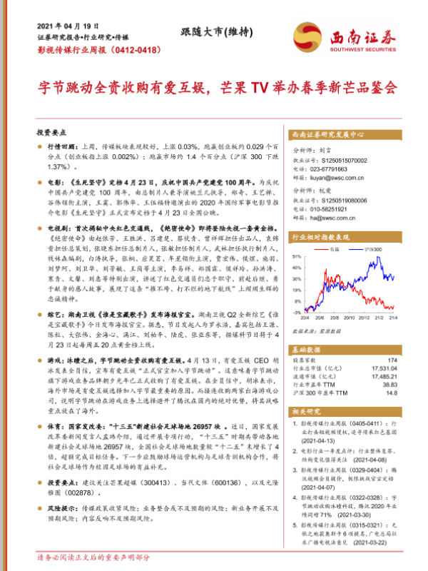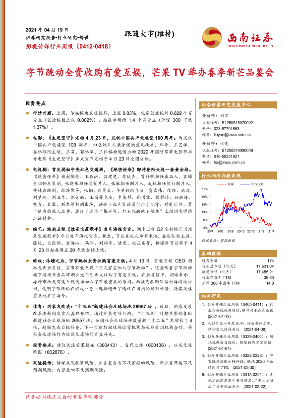 【西南证券】【20210419】20210419-西南证券-影视传媒行业周报:字节跳动全资收购有爱互娱,芒果TV举办春季新芒品鉴会-21页
