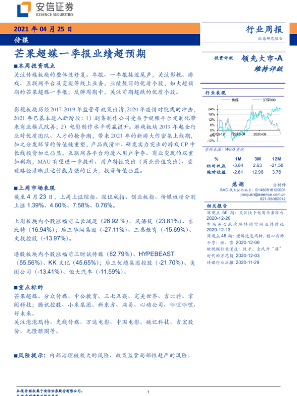 【安信证券】【20210425】芒果超媒一季报业绩超预期-13页