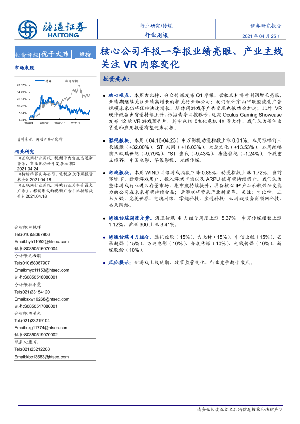 【海通证券】【20210425】20210425-海通证券-传媒行业周报:核心公司年报一季报业绩亮眼、产业主线关注VR内容变化-10页
