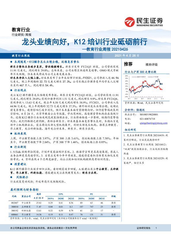 【民生证券】【20210426】教育行业周报:龙头业绩向好,K12培训行业砥砺前行-12页