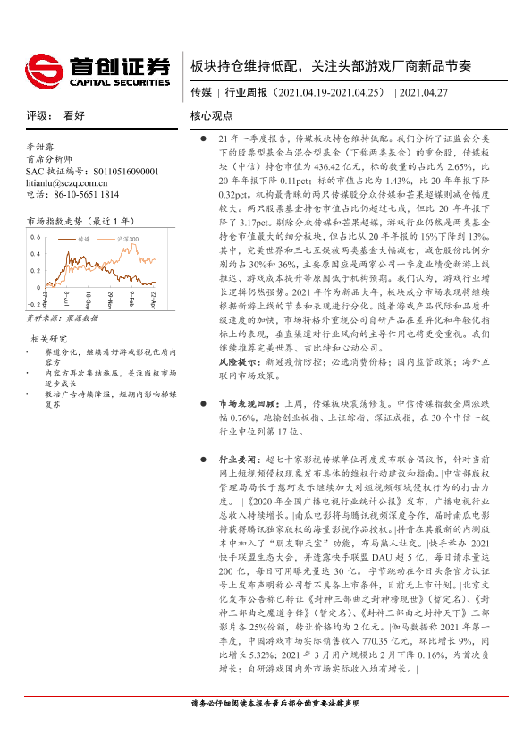 【首创证券】【20210427】20210427-首创证券-传媒行业周报:板块持仓维持低配,关注头部游戏厂商新品节奏-14页