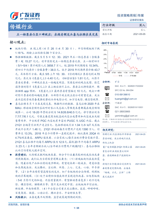 【广发证券】【20210505】20210505-广发证券-传媒行业投资策略周报:五一档票房凸显口碑效应;在线音频龙头喜马拉雅在美交表-23页