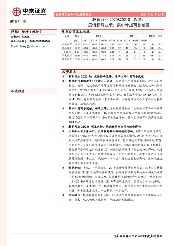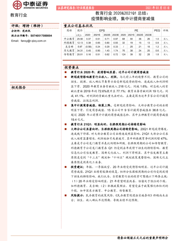 【中泰证券】【20210505】教育行业2020&2021Q1总结:疫情影响业绩,集中计提商誉减值-9页