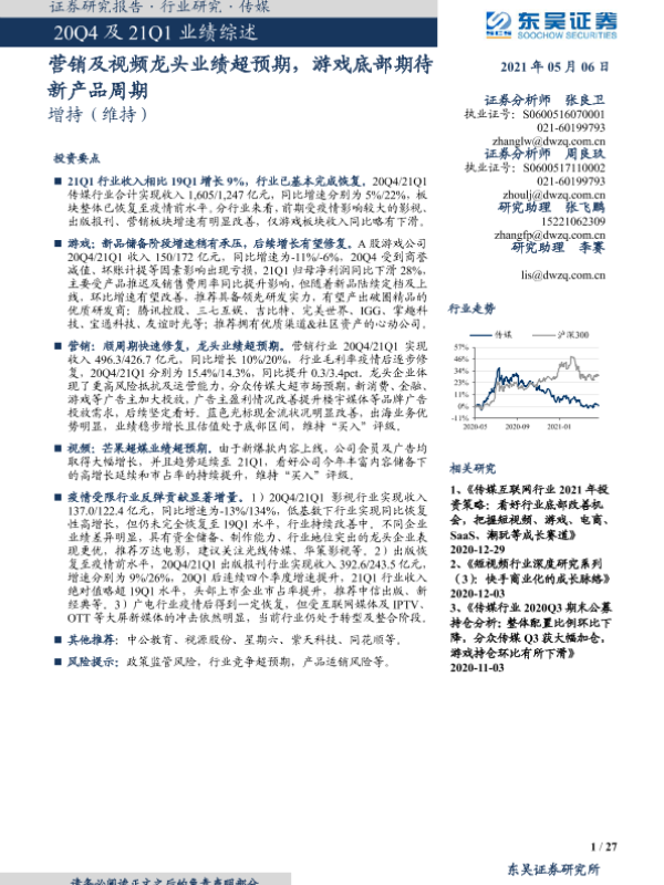 【东吴证券】【20210506】传媒行业:营销及视频龙头业绩超预期,游戏底部期待新产品周期-27页