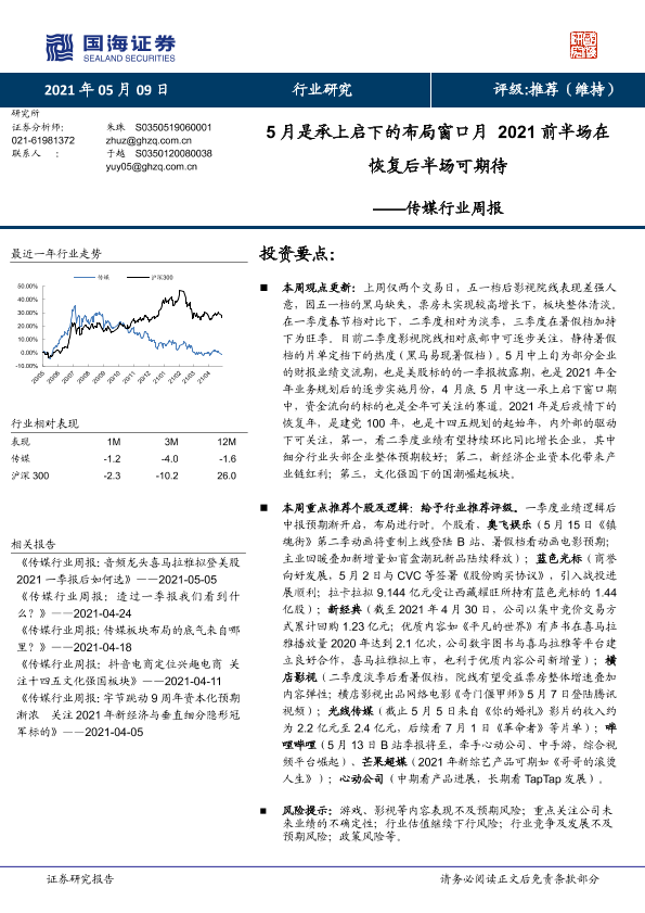 【国海证券】【20210509】20210509-国海证券-传媒行业周报:5月是承上启下的布局窗口月,2021前半场在恢复后半场可期待-19页