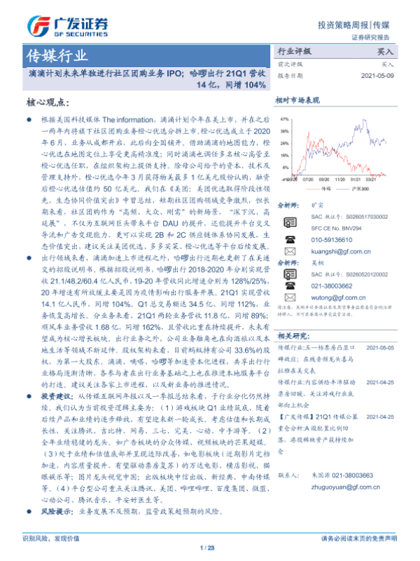 【广发证券】【20210509】20210509-广发证券-传媒行业周度策略:滴滴计划未来单独进行社区团购业务IPO;哈啰出行21Q1营收14亿,同增104%-23页
