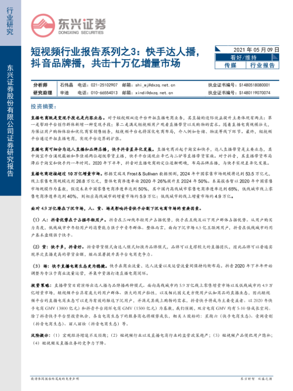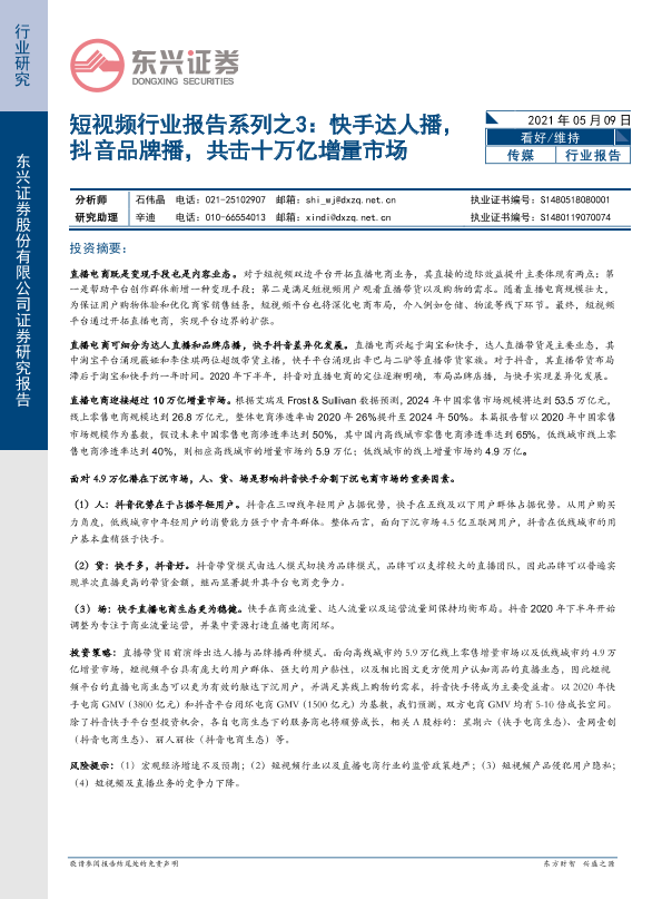 【东兴证券】【20210509】短视频行业报告系列之3:快手达人播,抖音品牌播,共击十万亿增量市场-19页