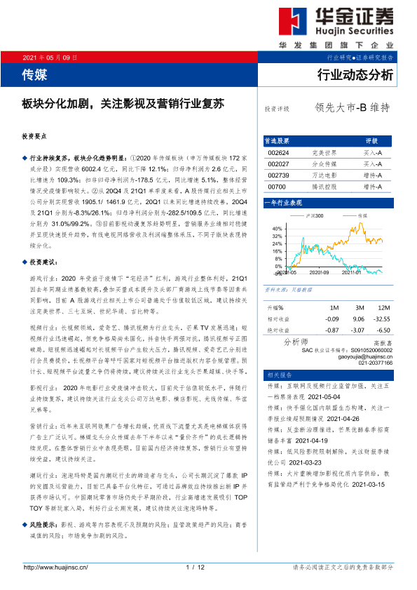 【华金证券】【20210509】20210509-华金证券-传媒行业动态分析:板块分化加剧,关注影视及营销行业复苏-12页
