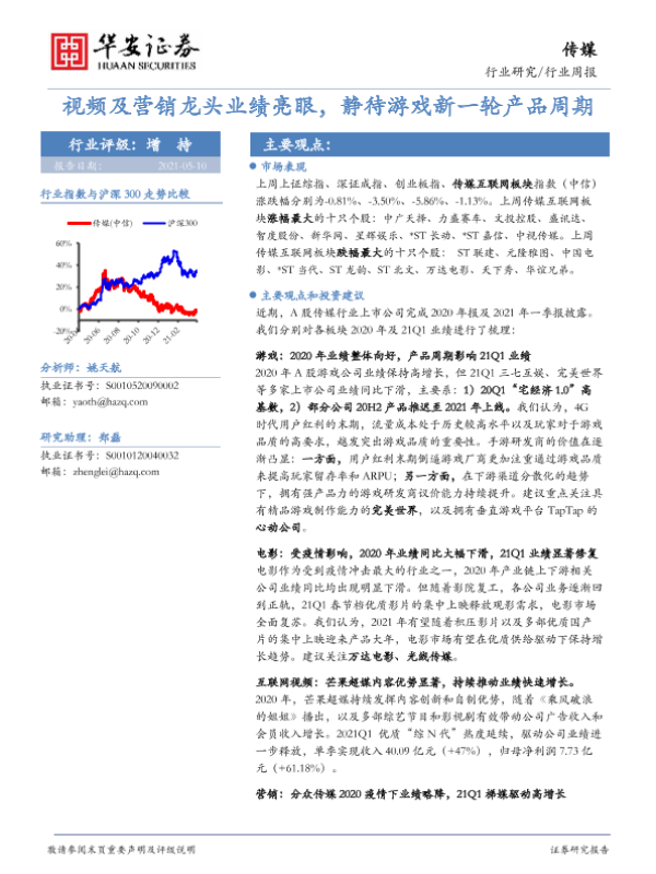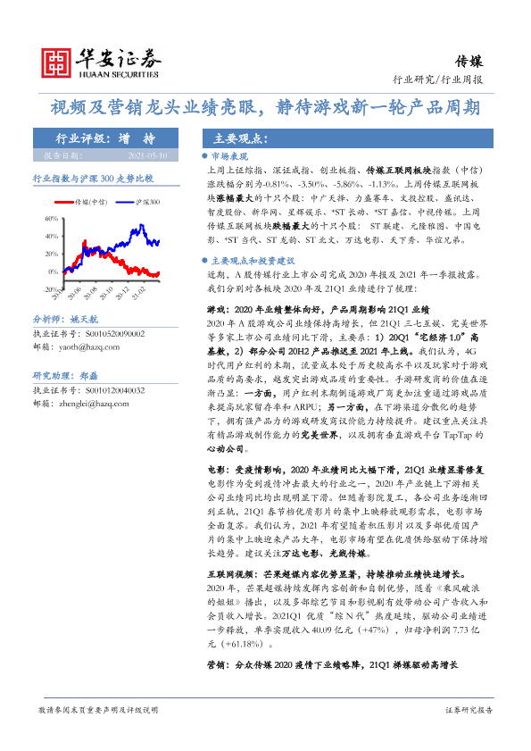 【华安证券】【20210510】20210510-华安证券-传媒行业周报:视频及营销龙头业绩亮眼,静待游戏新一轮产品周期-19页