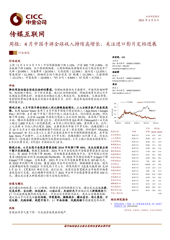 【中金公司】【20210509】传媒互联网周报:4月中国手游全球收入持续高增长,关注进口影片定档进展-26页